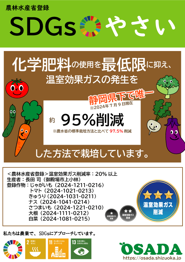 農林水産省の環境政策、農作物の環境負荷低減の取り組みにおいて、長田技術の野菜栽培方法が登録されました。